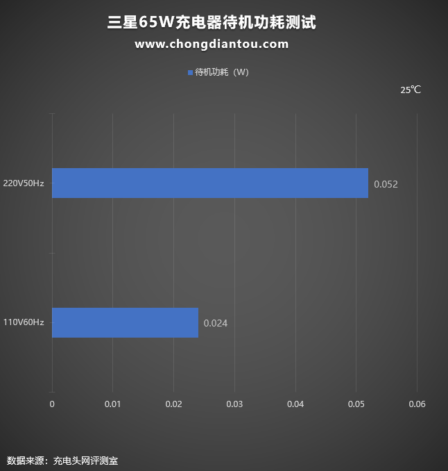 充电器如果经常插在插座上不使用也是会耗电的,只不过非常小而已。经过功率计测试,三星65W充电器在220V 50Hz的空载功耗为0.052W,换算下来一年损耗的电能约为0.45KW·h,若市价电为0.6元/KW·h,则充电器一年的电费约为0.27元左右。