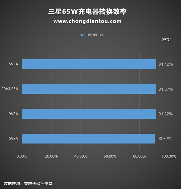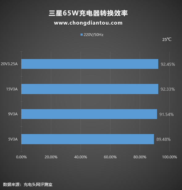 充电器本质上是一种转换设备,过程中会有损耗,以热量的形式散发出来。我们平时看充电器上面的参数输出100W或者65W是充电器可以为设备提供的最大输出功率,但充电器从插座上汲取的功率往往要更大一些,下面是三星65W充电器在220V 50Hz和110V 60Hz交流输入的情况下分别进行了转换效率测试,测试结果如下: