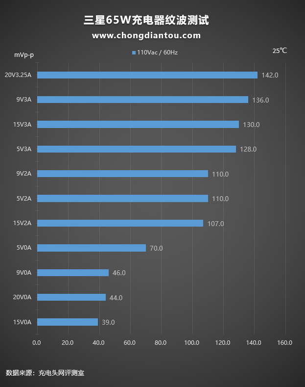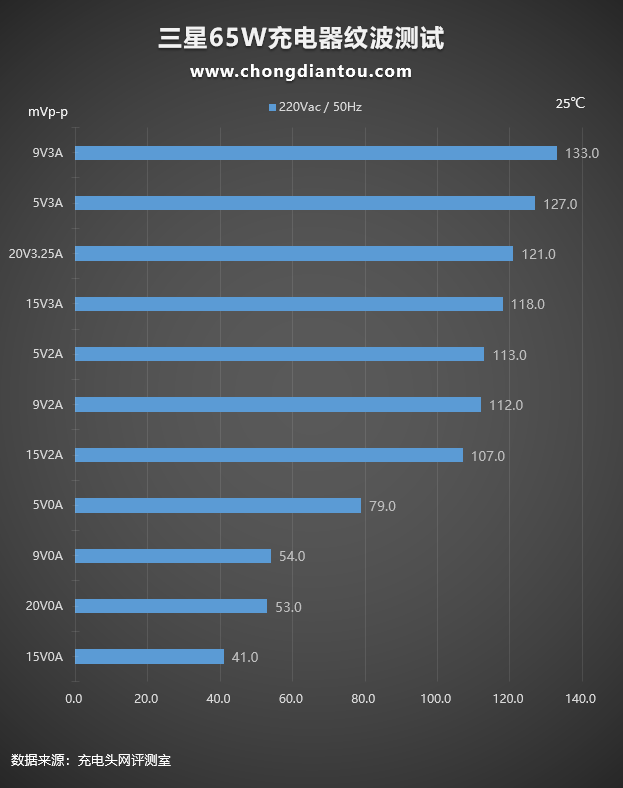 国家标准中充电器纹波要求是不高于200mVp-p,三星65W充电器在110V 60Hz、220V 50Hz输入电压下,所有输出功率纹波峰峰值均低于200mVp-p这个标准,表现不错。