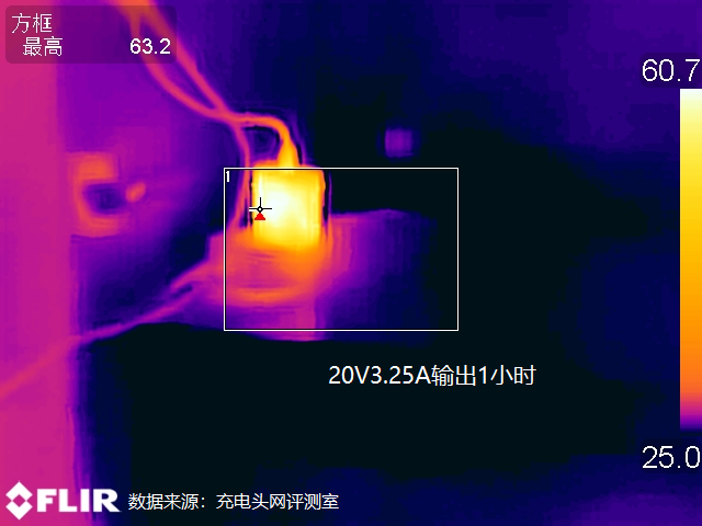 最后还对充电器的温控方面进行了测试,测试在25℃的恒温箱内进行,测试条件为以20V3.25A 65W的功率持续满载输出1小时后使用热成像仪对充电器表面的温度进行采集。