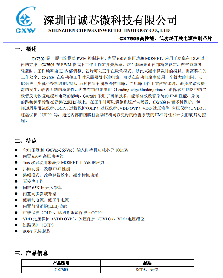 CX7509内置多种保护,包括逐周期限流保护(OCP),过载保护(OLP),过压保护(VDD OVP),VDD过压箝位,欠压保护(UVLO), 过温保护(OTP)等,通过内部的图腾柱驱动结构可以更好的改善系统的EMI特性和开关的软启动控制。