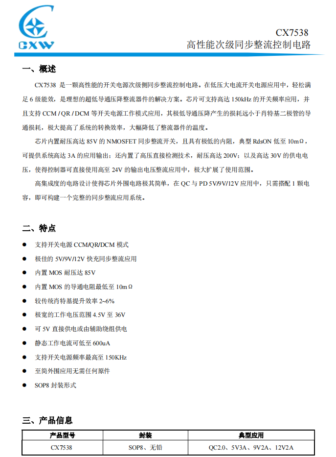 CX7538内置耐压高达85V的NMOSFET同步整流开关,且具有极低的内阻,典型RdsON低至 10mΩ,可提供系统高达3A的应用输出;还内置了高压直接检测技术,耐压高达200V;以及高达30V的供电电压,使得控制器可直接使用高至24V的输出电压整流应用中,极大扩展了使用范围。
