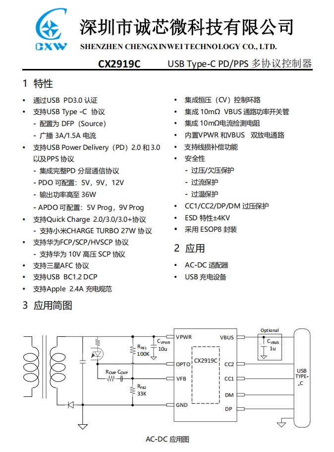 CX2919C内部集成 10mΩ VBUS通路功率开关管,并且集成10mΩ电流检测电阻,支持完善的保护功能,节省外围元件数量,简化电路,降低成本。采用ESOP8封装。