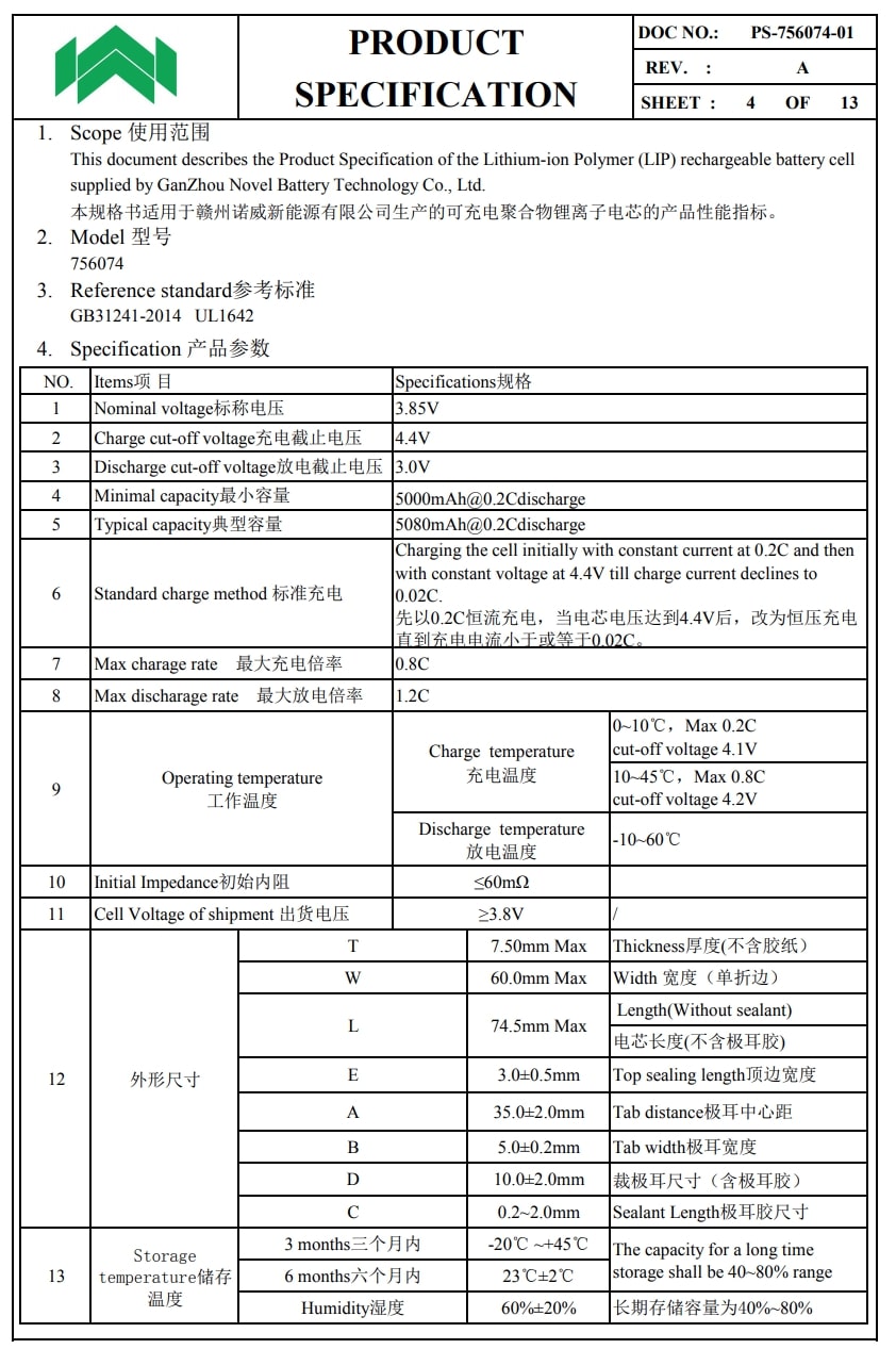 诺威756074电池,长74.5mm,宽60mm,厚度为7.5mm,容量为5000mAh,均压3.85V,充电限制电压为4.4V。支持0.8C快充和1.2C放电,单节满足22.5W快充输出需求。