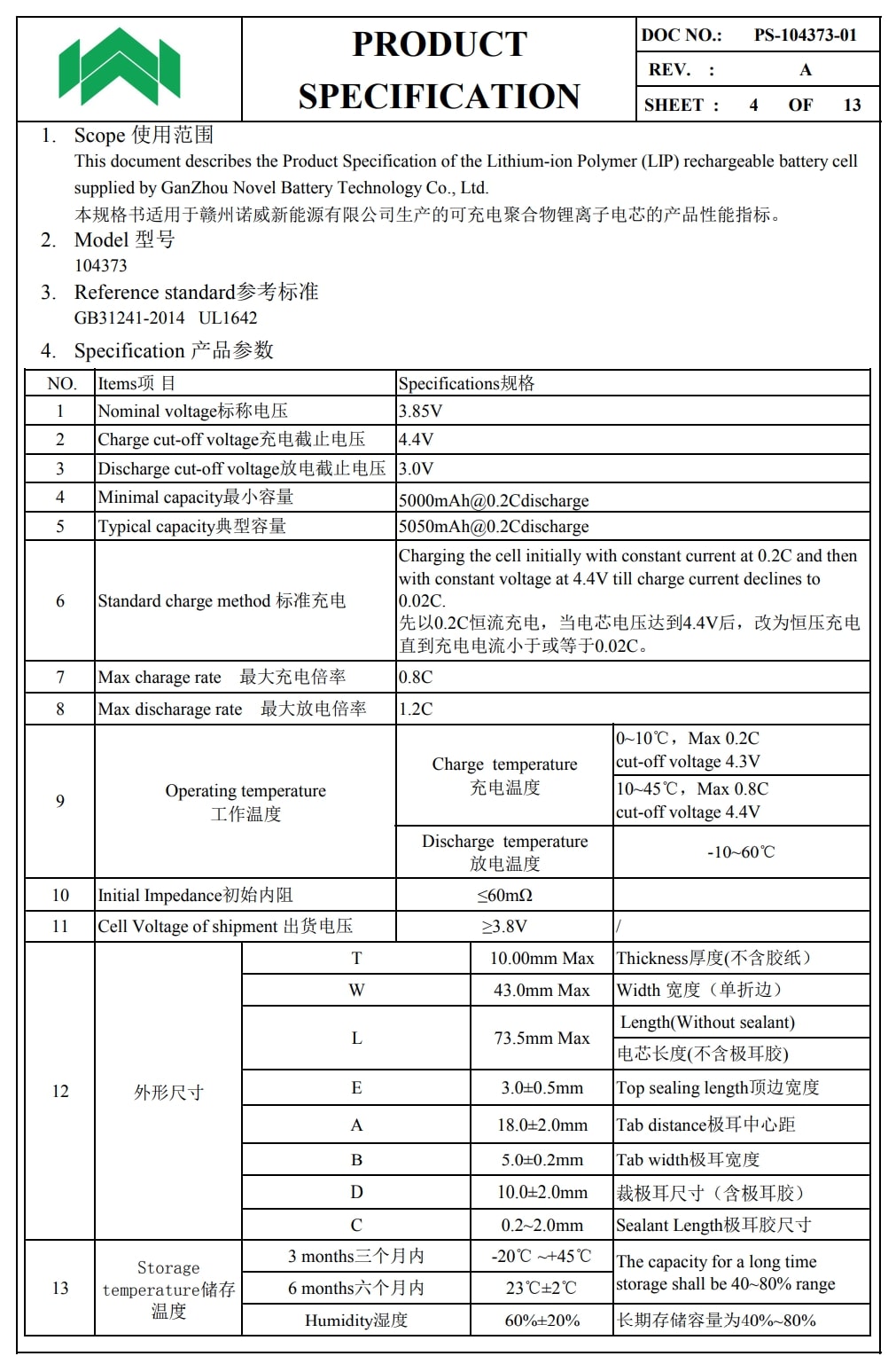 诺威104373电池规格书。