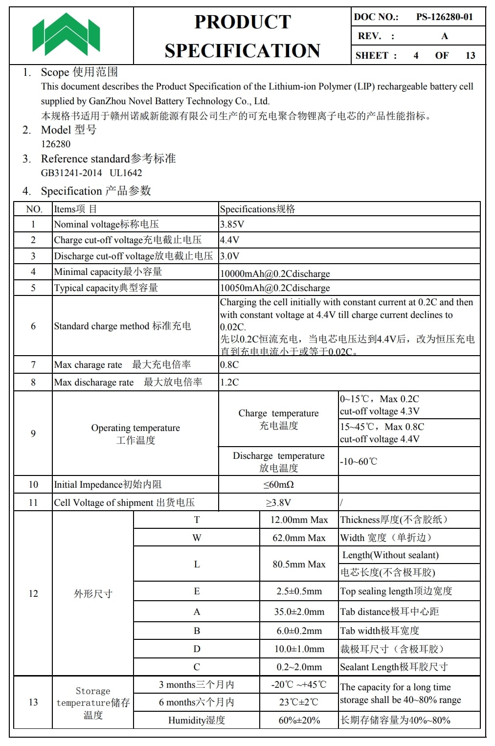 诺威126280电池规格书。
