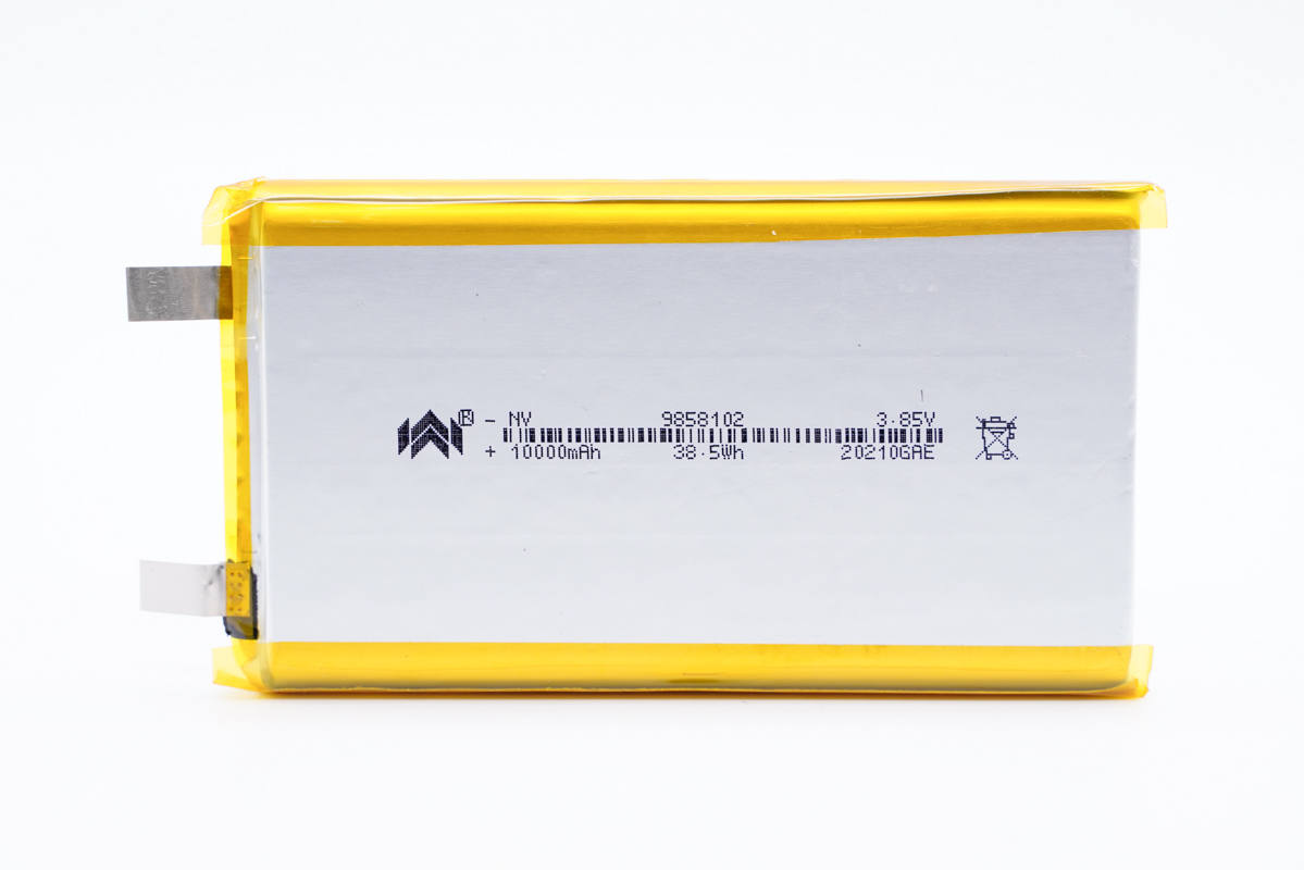 诺威9858102电池,长102mm,宽58mm,厚度为9.8mm,容量为10000mAh,均压3.85V,充电限制电压4.4V。支持0.8C快充和1.2C放电,单颗满足22.5W双向快充需求,也可多颗串联或者并联生产大容量移动电源。