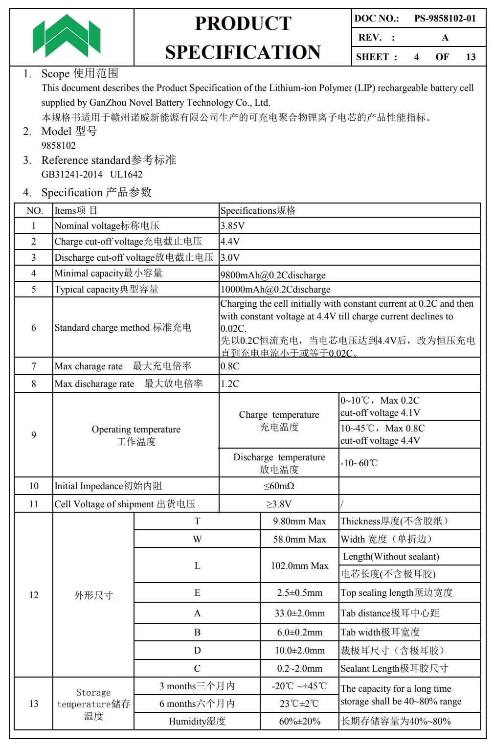 诺威9858102电池规格书。