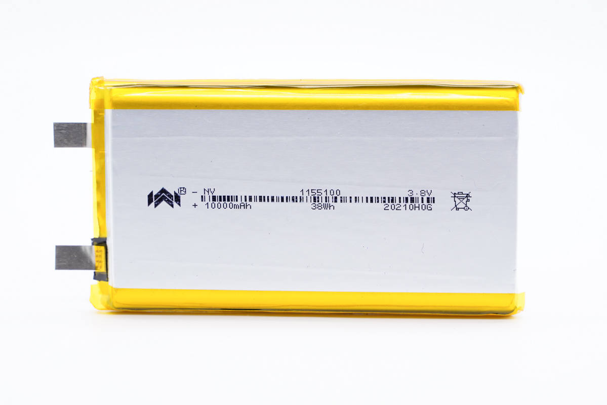 诺威1155100电池,长100mm,宽55mm,厚度为11mm,容量为10000mAh,均压3.8V,充电限制电压4.35V。支持0.8C快充和1.2C放电,单颗满足22.5W双向快充需求,也可两颗串联或者并联生产20000mAh移动电源。