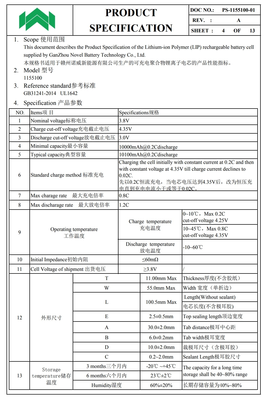 诺威1155100电池规格书。