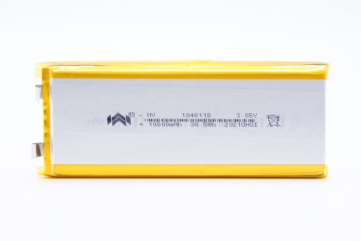 诺威1048118电池,长118mm,宽48mm,厚度为10mm,容量为10000mAh,均压3.85V,充电限制电压4.4V。支持0.5C充放电,可多颗串联或者并联生产大容量移动电源。