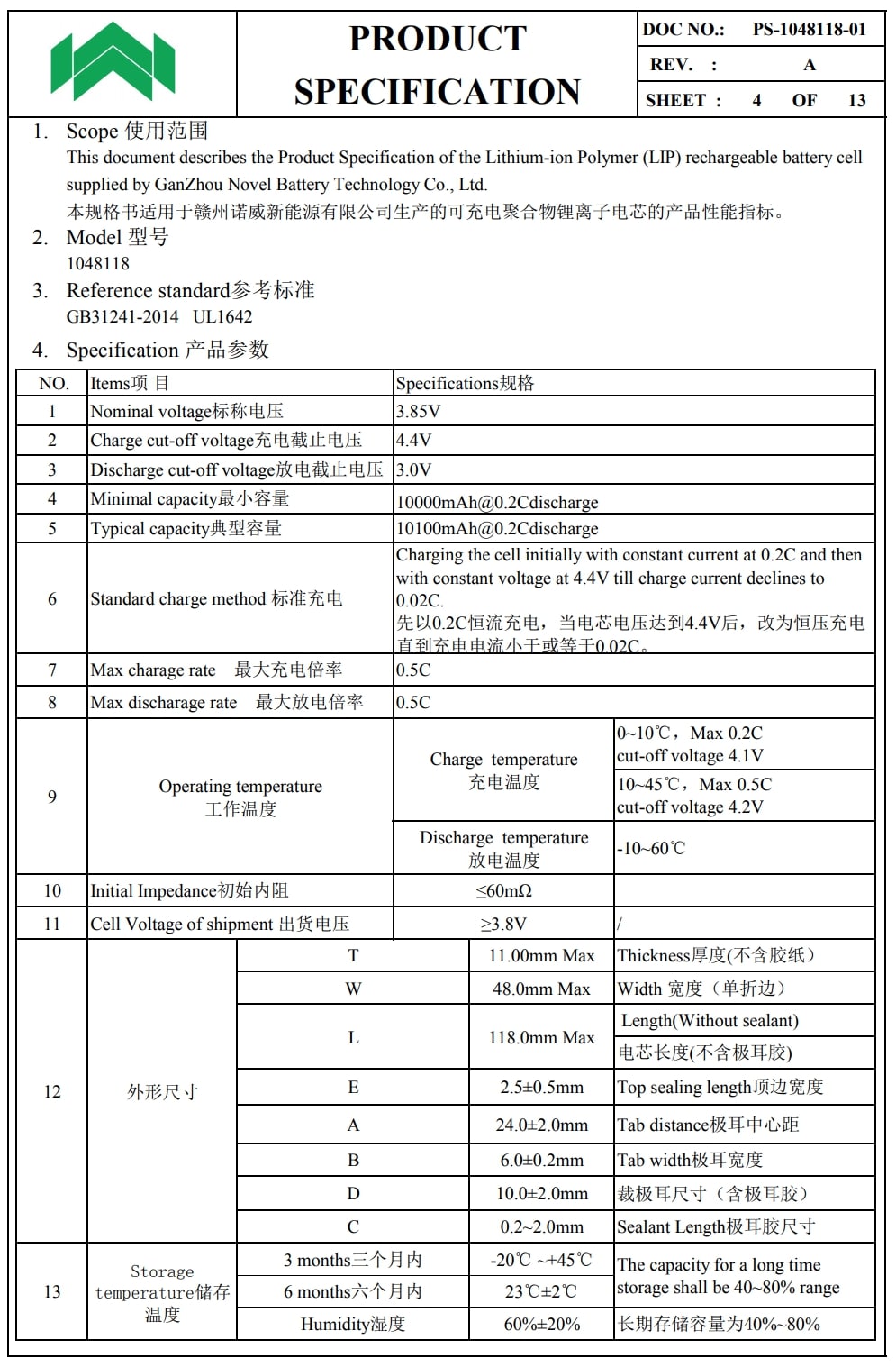 诺威1048118电池规格书。