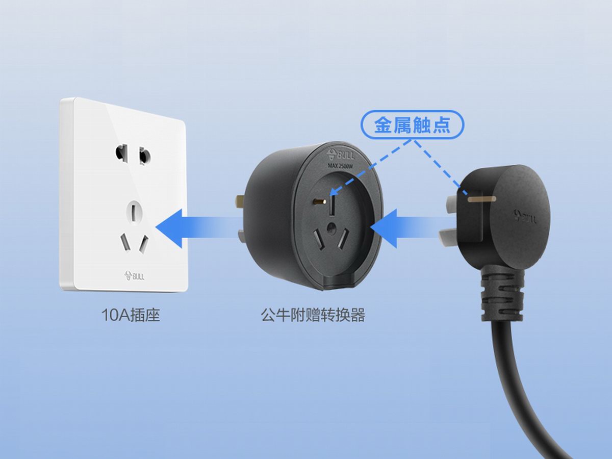 公牛风尚款随车充原配线缆插头为16A大电流插头规格,可承受大电流传输,与空调插座的家用16A插座匹配使用。考虑到16A插座取电的环境的不便之处,公牛配送了一个10A/16A转换器,即使出门在外也能让最常见的10A插座通过随车充充电。转换器上带有金属触点,16A插头通过金属触点连接反馈后,自动识别信号并控制充电电流为10A安全电流,充电安全放心。