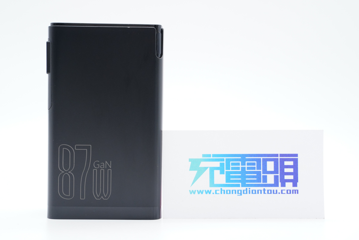 Baseus倍思此次推出的87W能量堆共有黑白两个配色,此次充电头网拿到的是黑色版本,壳体上面印制着87W的标识,这也说明了能量堆的性能所在,GaN说明采用了氮化镓技术。