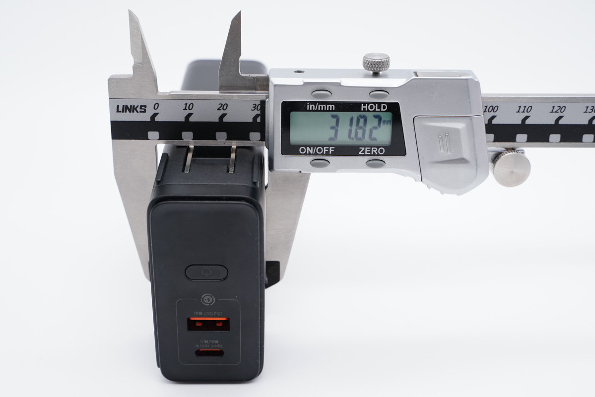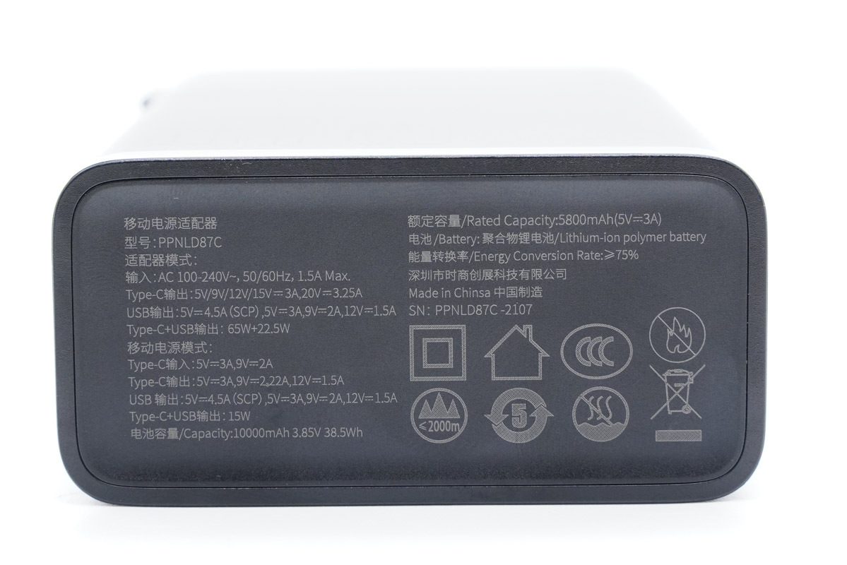 充电器模式下:支持100-240V 50/60Hz 1.5A的宽电压输入,USB-C支持5-15V3A、20V3.25A最高65W输出;而USB-A则支持18W快充,并且支持华为SCP 5V4.5A 22.5W快充。双口同时输出执行65W+22.5W输出模式,双口独立快充。
