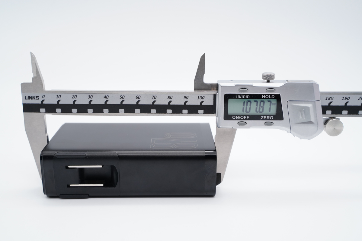 尺寸方面,使用卡尺实测Baseus倍思87W能量堆的长度约为107.87mm。