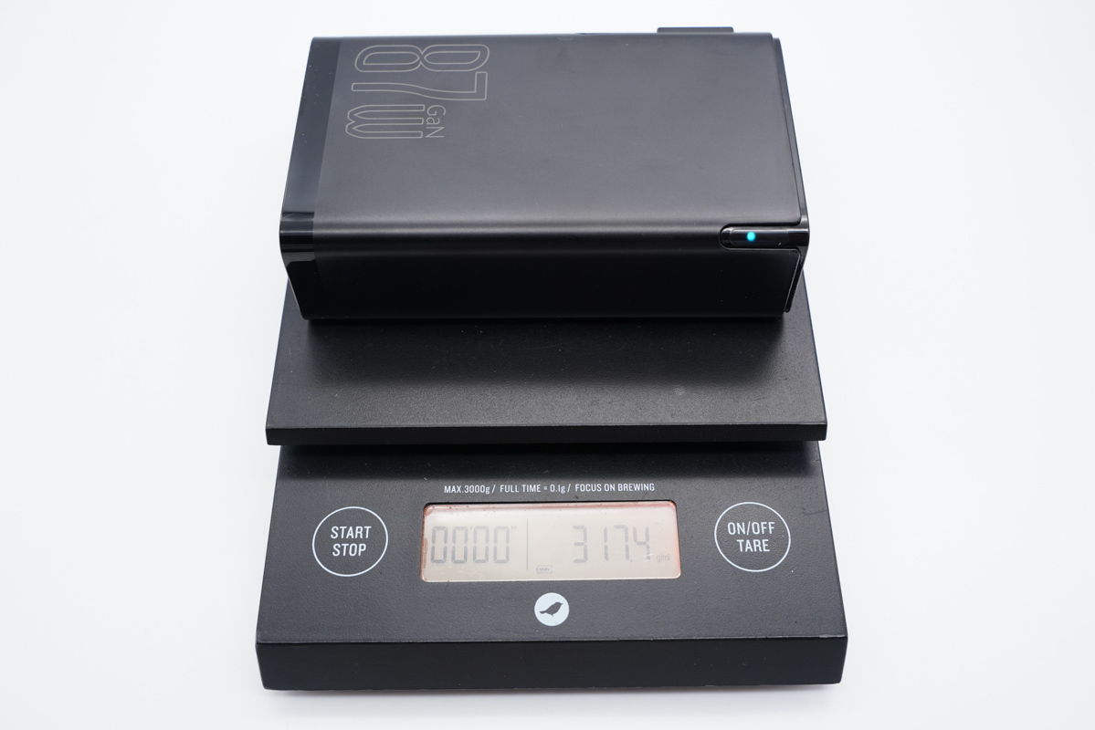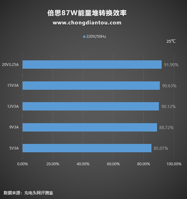 充电器本质上是一种转换设备,过程中会有损耗,以热量的形式散发出来。我们平时看充电器上面的参数输出100W或者65W是充电器可以为设备提供的最大输出功率,但充电器从插座上汲取的功率往往要更大一些,下面是Baseus倍思87W能量堆在220V 50Hz和110V 60Hz交流输入的情况下分别进行了转换效率测试,测试结果如下: