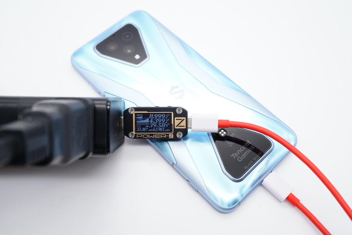 进入实测环节,充电器模式下使用USB-C为黑鲨3S充电,可以握手9V电压,功率为39.58W。