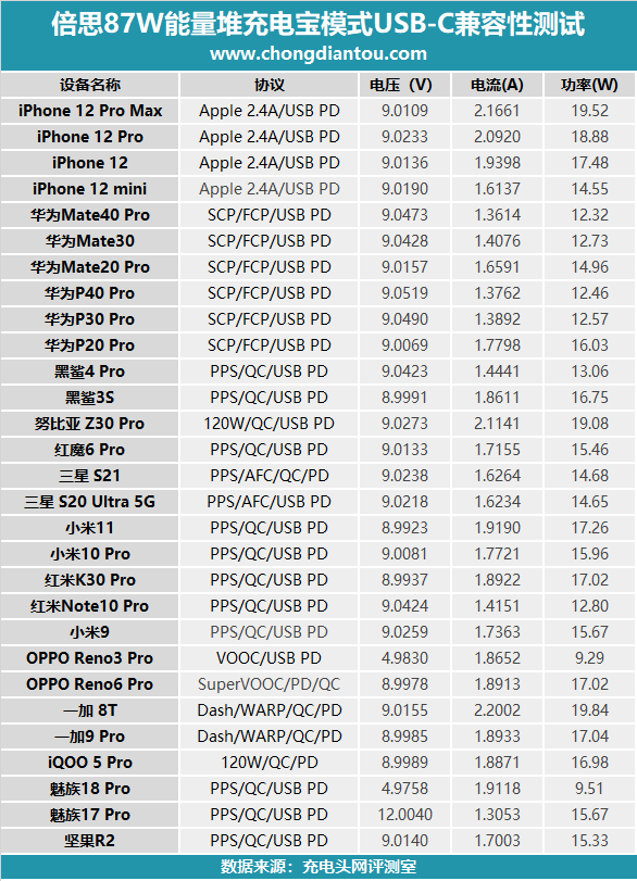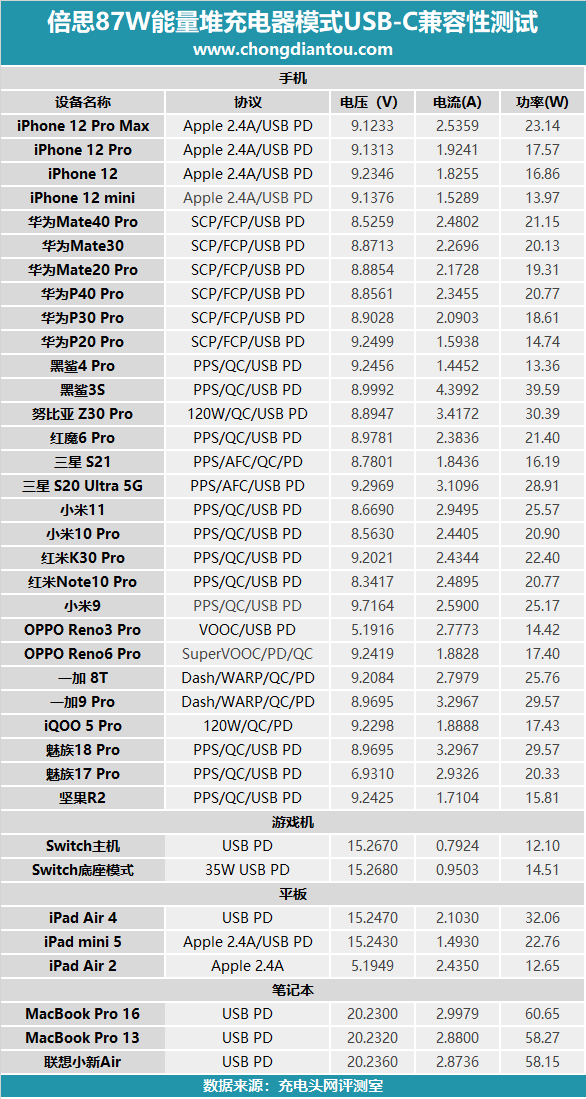 测试数据汇总,对于iPhone、笔记本和平板可以提供PD快充,手机这里也是几乎清一色的9V快充,部分机型可以握手PPS大功率充电。