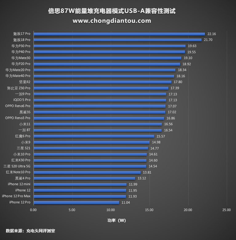 USB-A支持18W快充与22.5W SCP快充,柱状图中整体看上去相差不大。