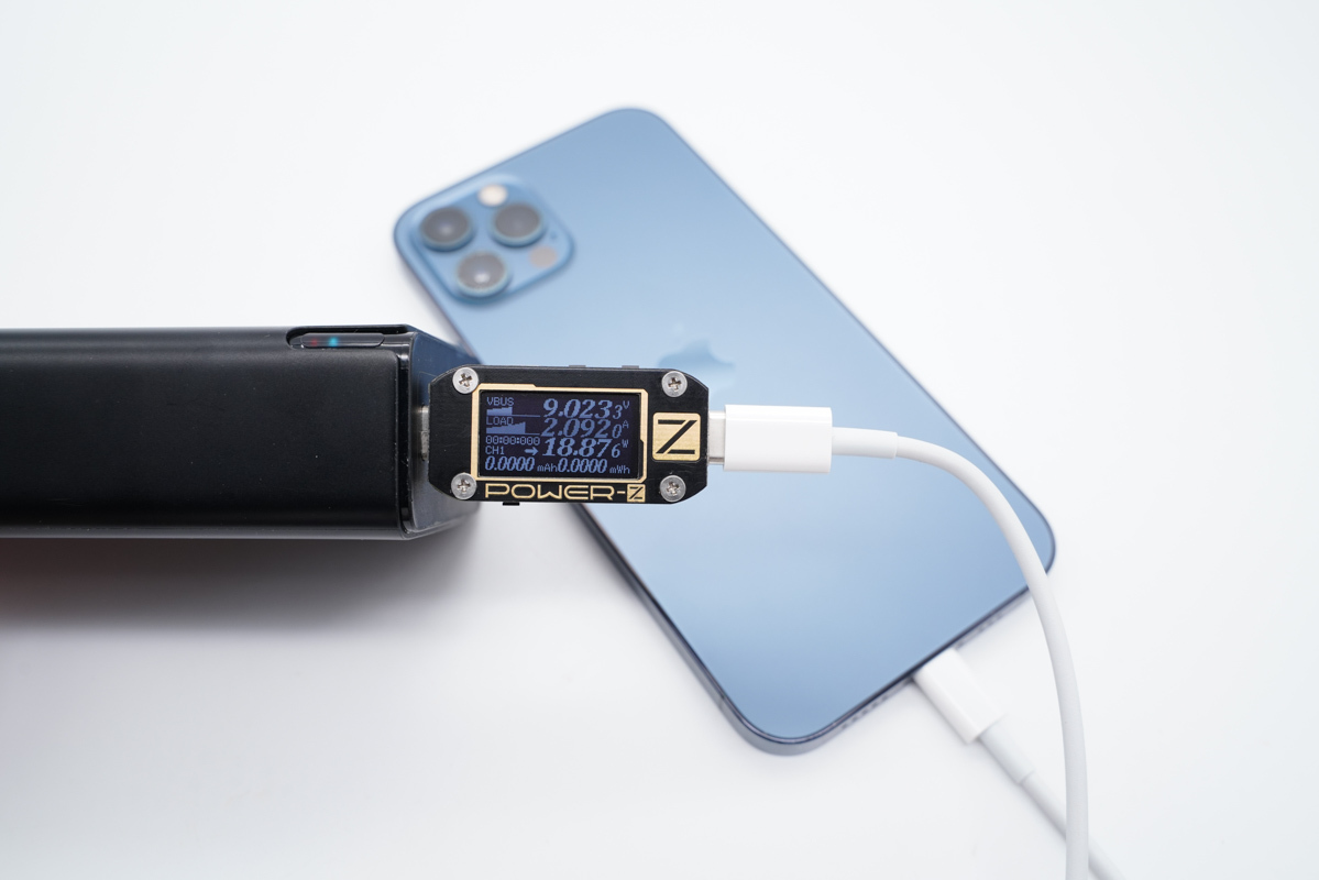 充电宝模式下实测环节,使用USB-C为iPhone 12 Pro充电,可以提供9V PD快充电压,功率为18.87W。