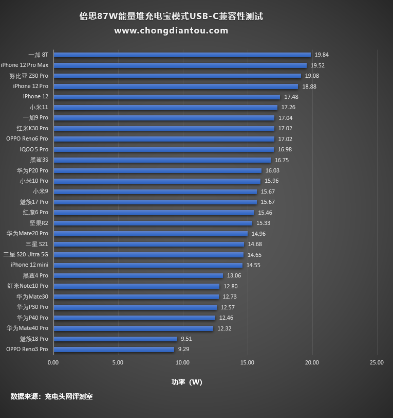 充电宝模式下的USB-C支持20W PD快充,从整理的数据来看兼容大部分设备的快充。