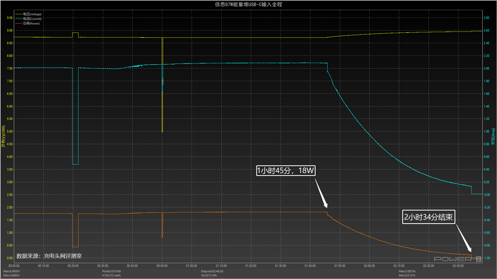 这里还使用POWER-Z KM001C采集了通过USB-C输入全程的数据,测试于1小时45分功率开始下降,于2小时34分结束。