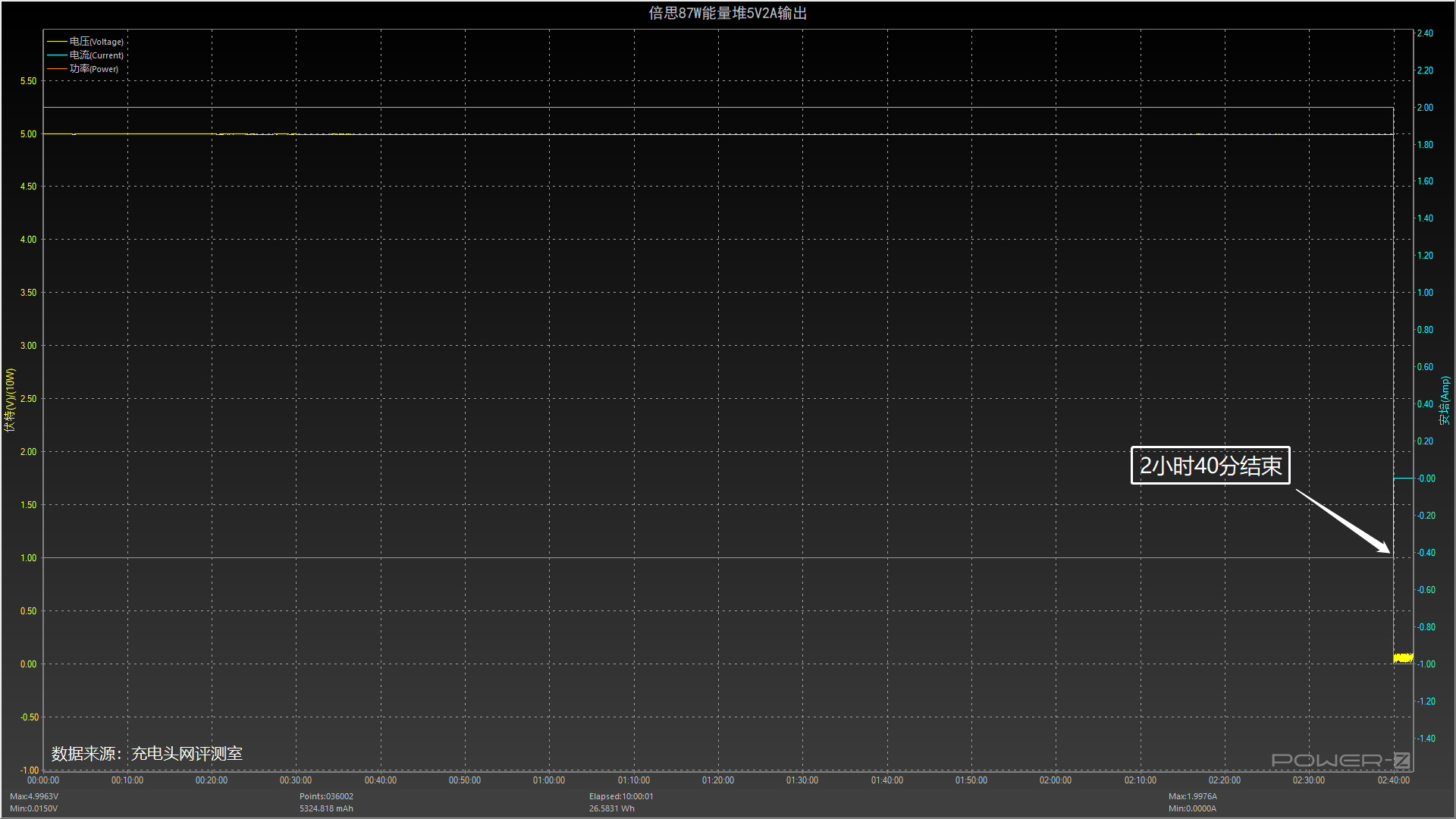 首先让Baseus倍思87W能量堆以5V2A 10W的功率持续输出,全程耗时2小时40分。放出的能量约为26.5831Wh,效率约为26.5831/38.5=69.04% 。