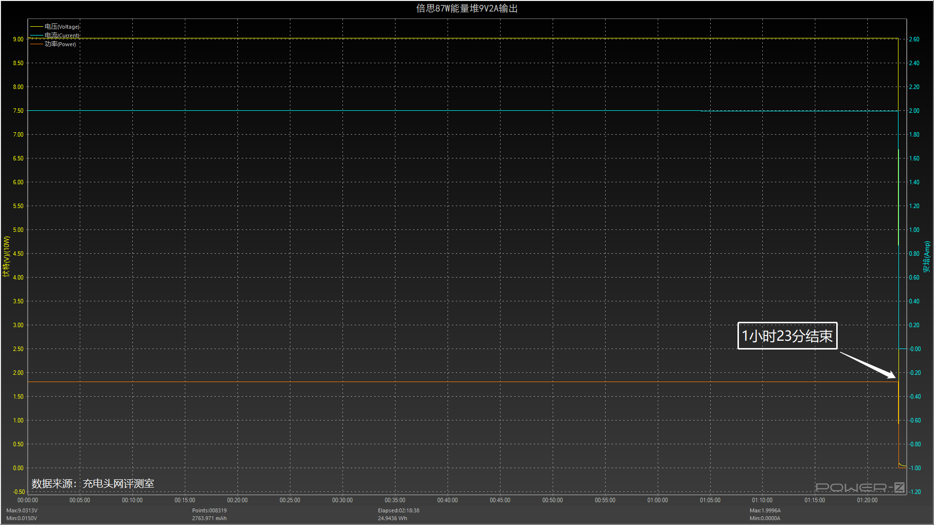 将电压提升至9V,让Baseus倍思87W能量堆以9V2A 18W的功率持续输出,全程耗时1小时23分。放出的能量约为24.9436Wh,效率约为24.9436/38.5=64.78% 。