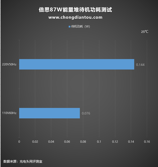 充电器如果经常插在插座上不使用也是会耗电的,只不过非常小而已。经过功率计测试,Baseus倍思87W能量堆在220V 50Hz的空载功耗为0.144W,换算下来一年损耗的电能约为1.26KW·h,若市价电为0.6元/KW·h,则充电器一年的电费约为0.75元左右。