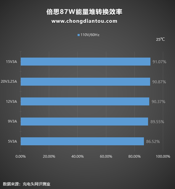 110V 60Hz下,充电器的转换效率从86.52%到91.07%不等。