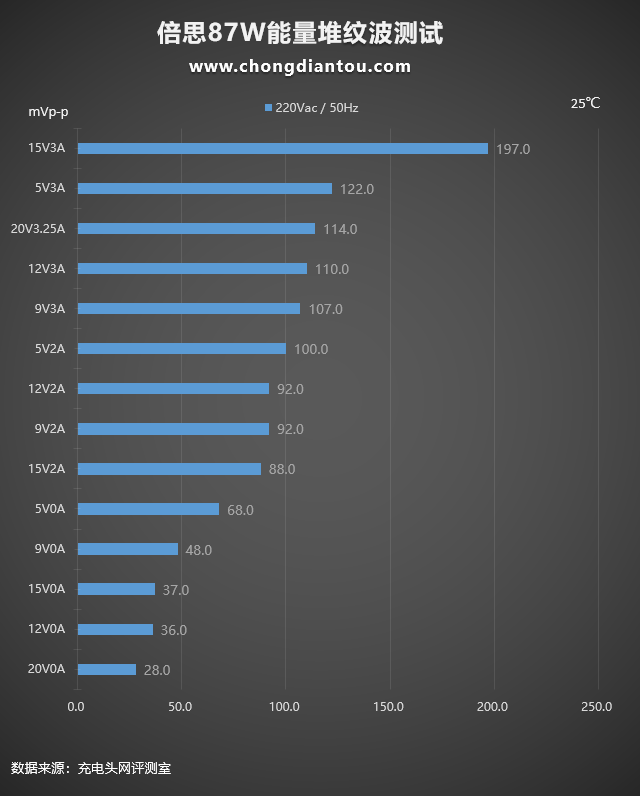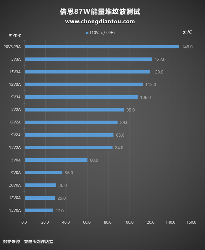 国家标准中充电器纹波要求是不高于200mVp-p,Baseus倍思87W能量堆在110V 60Hz、220V 50Hz输入电压下,所有输出功率纹波峰峰值均低于200mVp-p这个标准,表现不错。