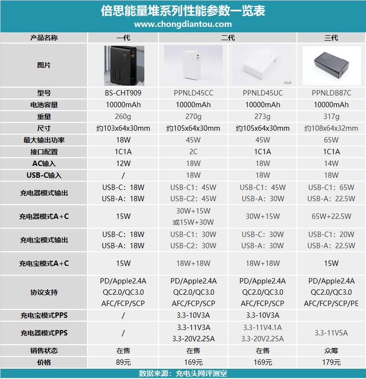 此次Baseus倍思将旗下的能量堆系列进行了更新,推出了87W能量堆。自此Baseus倍思已经推出了第三代能量堆产品。此次充电头网将三代能量堆汇总到表格当中,性能参数详情方便大家定准定位查找。