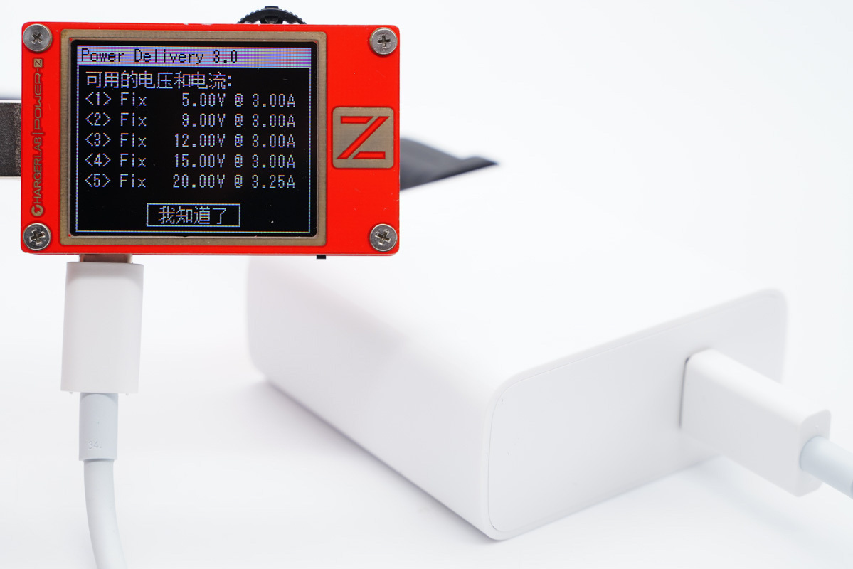 当快充套装触发PD快充时可以提供5V-15V 3A、20V3.25A五个固定输出档位,支持最高65W的PD输出功率。