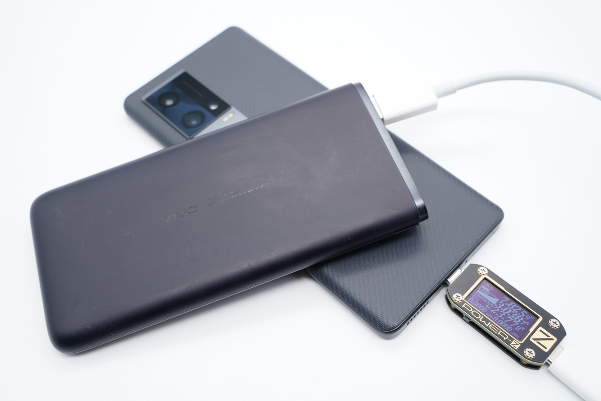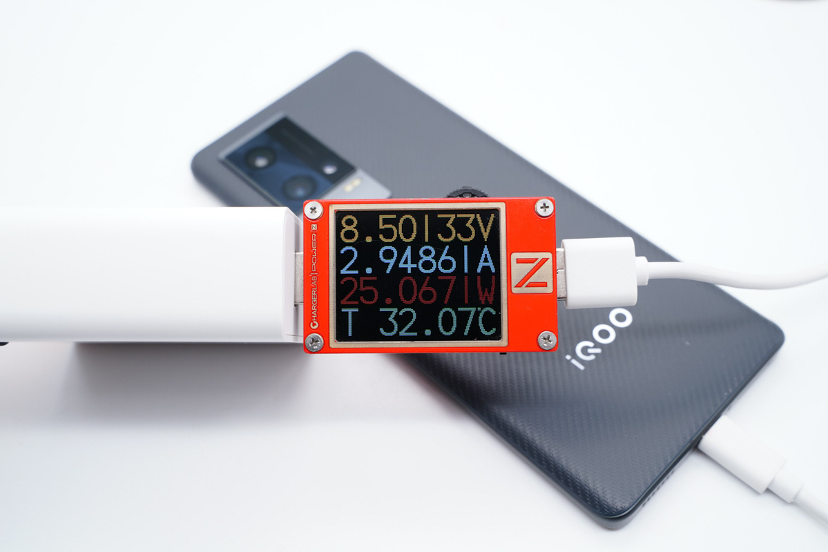 使用vivo 33W充电宝搭配iQOO快充线材为iQOO8 Pro充电,功率为7.82V 3.03A 23.77W。