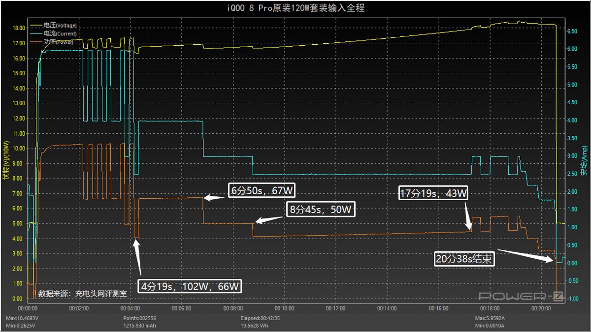 除了测试充电兼容性外,此次还新增了充电全程的实测,上图是使用原装120W快充套装为iQOO 8 Pro的充电全程,整个过程分为五个阶段,于20分38s充电结束。