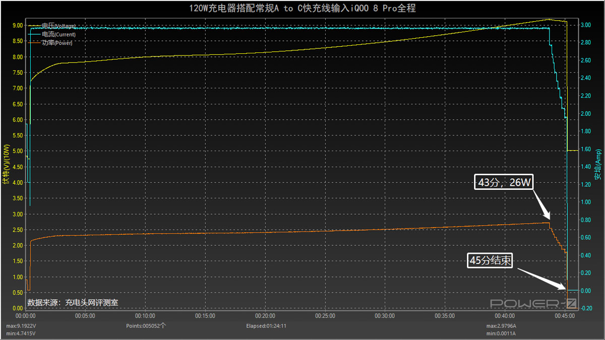 要想实现120W大功率,快充充电器和线材必须是原装,但将线材更换会如何,所以此次新增了使用原装120W充电器搭配常规的A to C快充线材为iQOO 8 Pro的充电全程。实测几乎大部分时间输入功率均在26W左右,于45分充电结束,虽然相较于原套装的充电时间多了一倍,不过依旧还是很快的。