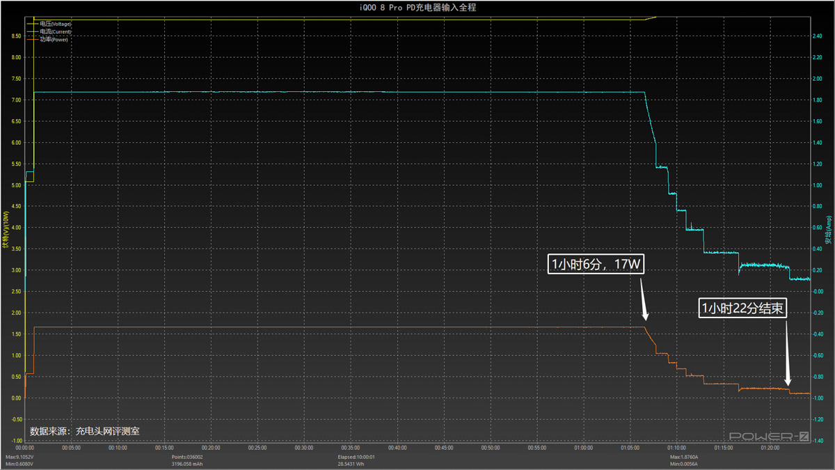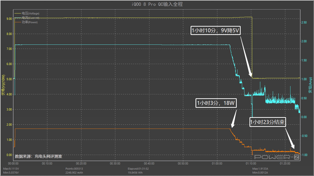 除了PD充电器,此次也新增了QC充电的全程测试,于1小时3分开始降功率,1小时10分时电压由9V降至5V,1小时23分充电结束。