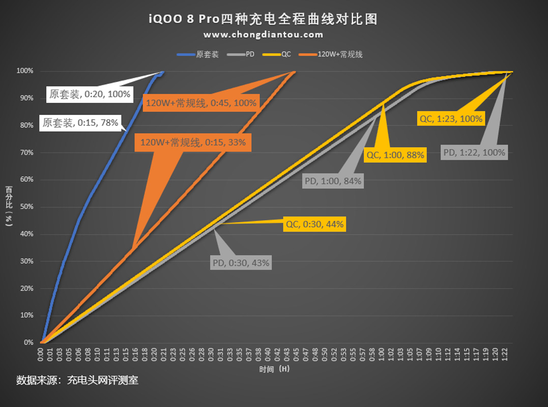 重头戏来了,这是原120W快充套装、120W加常规A to C线、PD、QC四种为iQOO 8 Pro的充电全程曲线图的汇总。首先原120W快充套装自然最快,其次是120W加常规A to C线。最后PD和QC输入的全程曲线图几乎相同,毕竟功率都是18W输入。