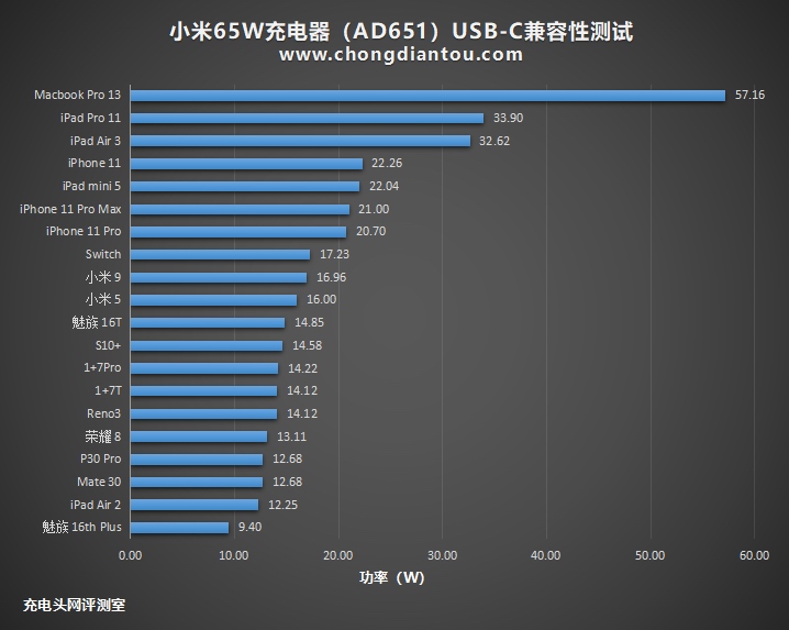 将数据绘制成直观的柱状图,iPhone 11系列的功率都超过了20W,其他主流安卓设备在12-16W之间,两台大尺寸iPad平板功率超过了30W,为Macbook Pro笔记本充电可达到57W。