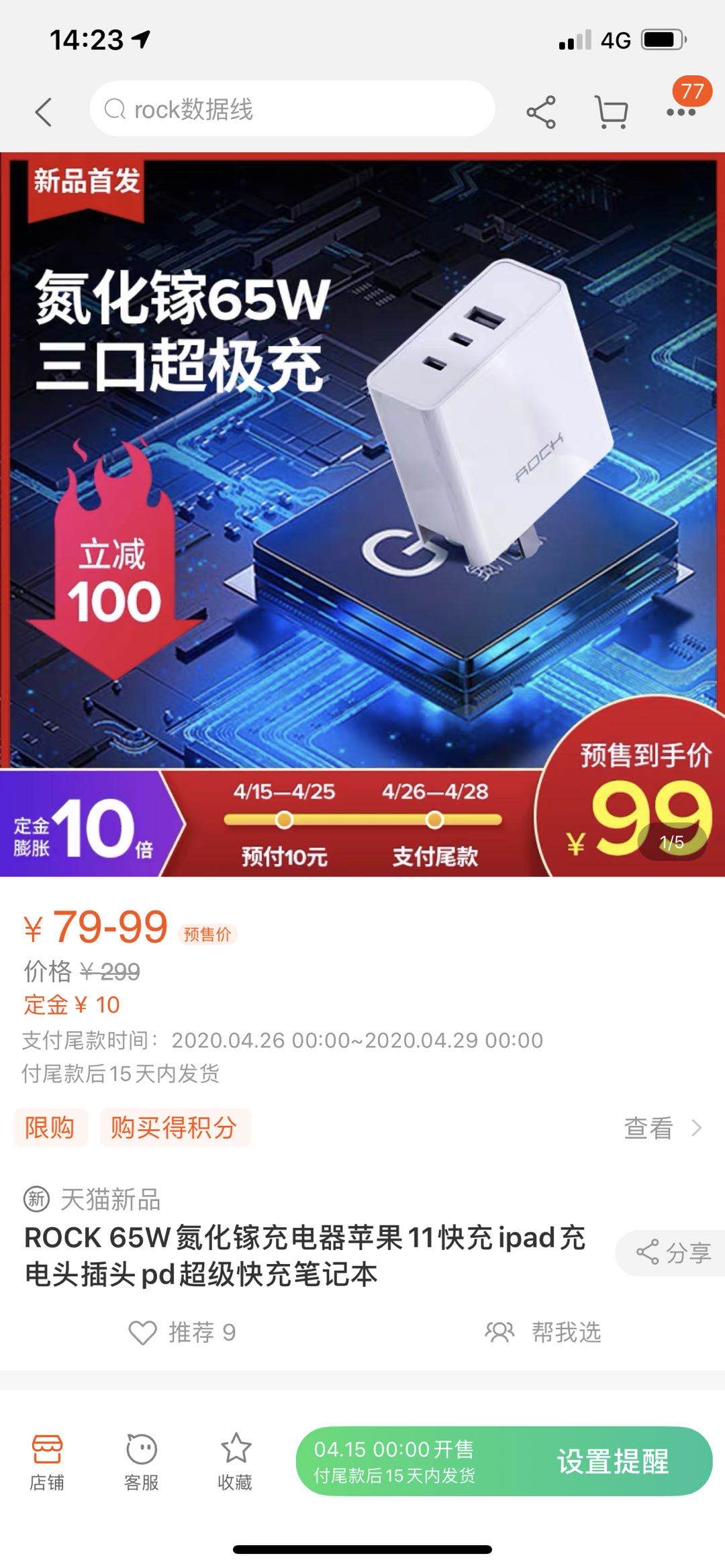 今日,ROCK这款搭载“中国芯”的65W 2C1A氮化镓快充充电器正式上架开卖。 ROCK天猫旗舰店产品预售界面显示,ROCK最新款65W氮化镓充电器售价仅为99元,在该功率区间,打破了此前由小米保持的149元的最低售价。相比小米65W氮化镓快充,ROCK 65W氮化镓快充不仅价格下降三分之一,而且还新增了两个充电接口以及折叠插脚,实用性能更强。