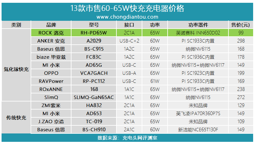 在产品的售价方面,充电头网统计包括ANKER、RVAPOWER、倍思、毕亚兹、小米、OPPO、SlimQ等品牌在内的8款60-65W氮化镓快充充电器,以及紫米、小米、京造、倍思等品牌的65W级三口传统快充充电器。