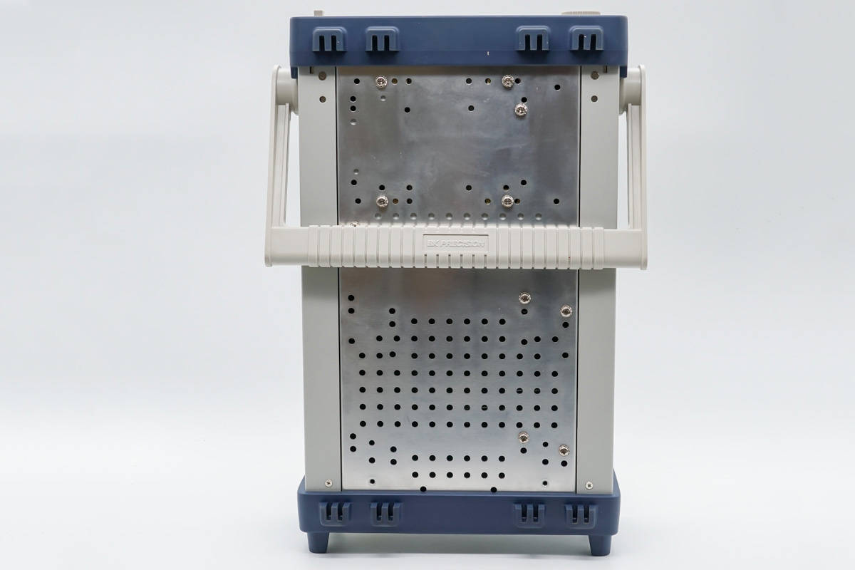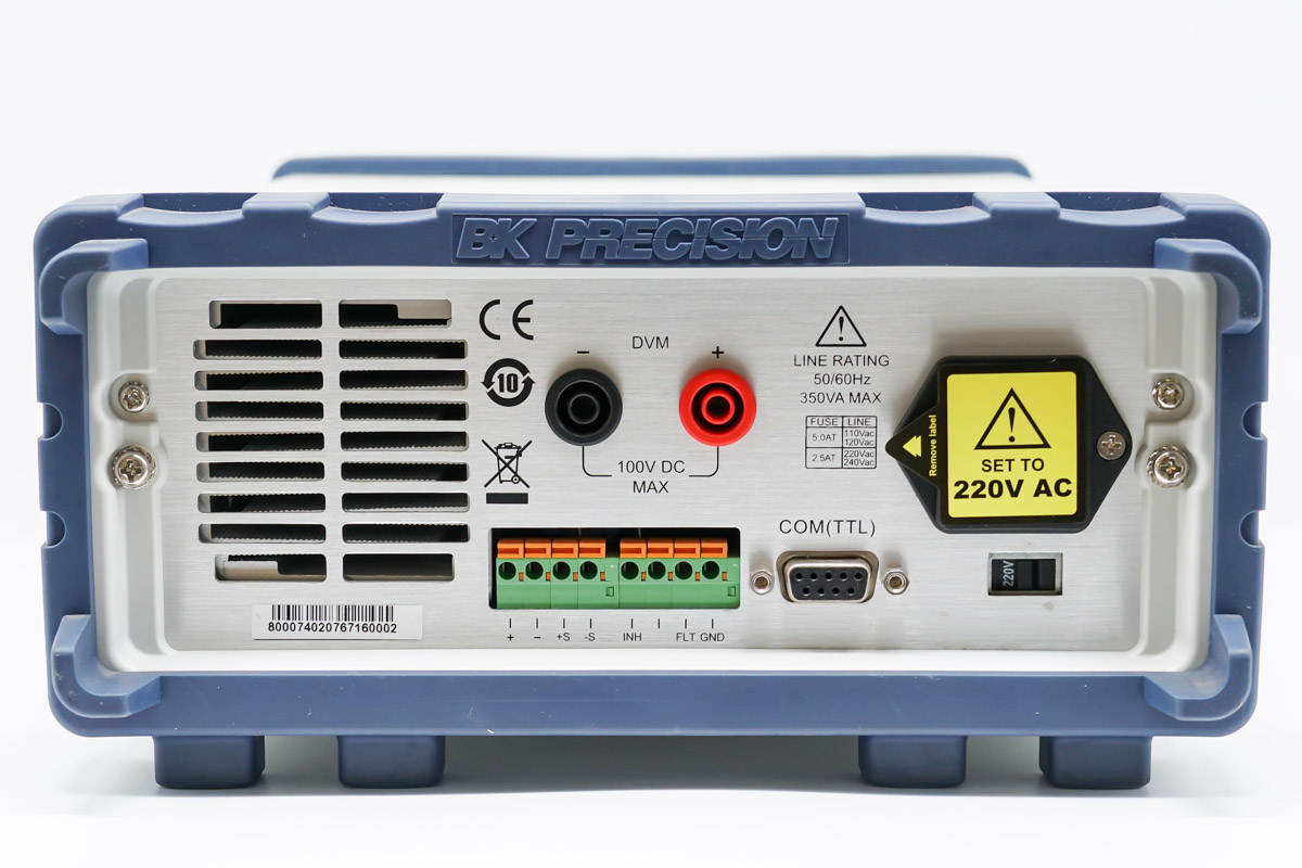 电源背面左侧是散热窗口,底部为8针触发和远端补偿端子,9针串口连接器,输入电压选择开关,中间为电压测量端子,右侧为电源输入插座,出厂设定为220V AC输入。