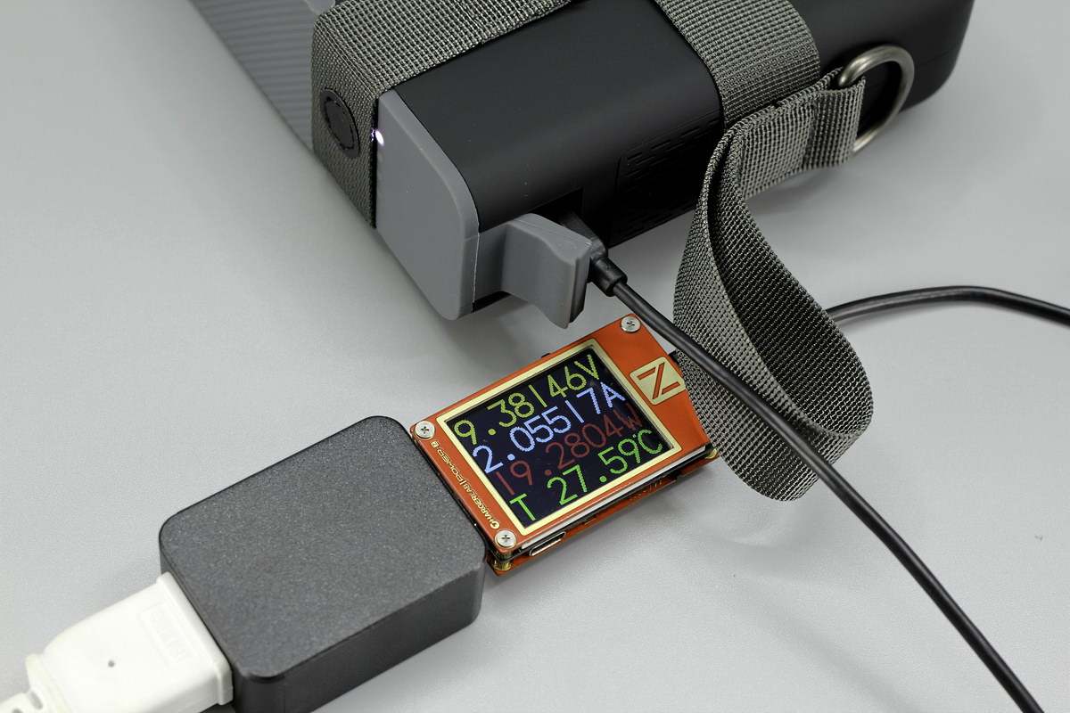 使用附带的充电器给电源充电,通过ChargerLAB POWER-Z KT002测得输入功率为9.38V 2A 19.28W。