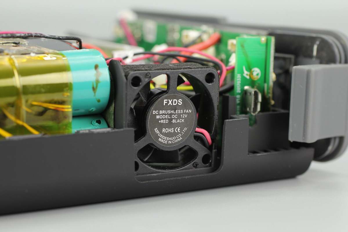 侧面固定有小风扇,来自FXDS富禧德硕电子,额定电压12V,通过了CE和RoHS认证。