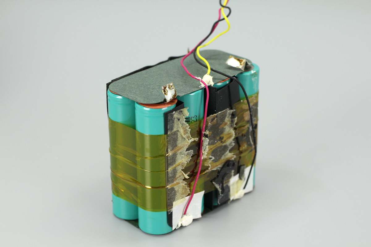 将电池组取出,两端贴有青稞绝缘纸,中间缠绕胶带固定,电池两两之间设有隔离板。