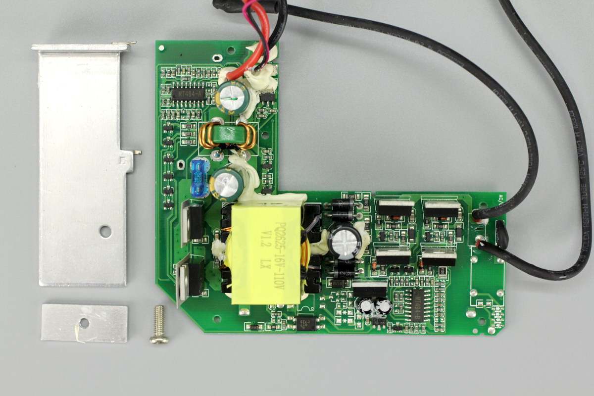 逆变器PCB板一侧设有散热片帮助MOS管散热,和AC插口连接的导线套有绝缘管。