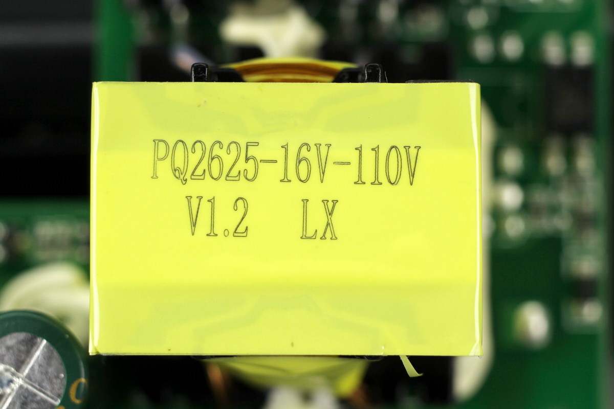 逆变升压变压器特写,顶部喷码有信息,用于四串锂电池升压到110V。