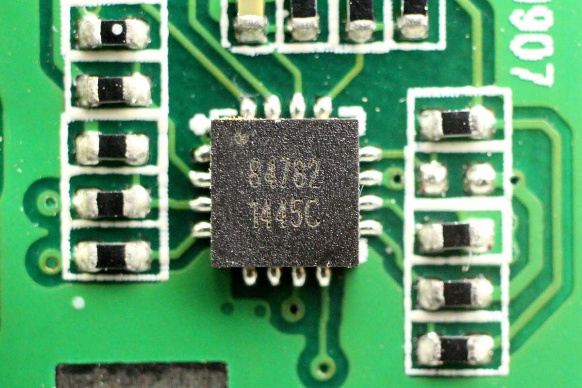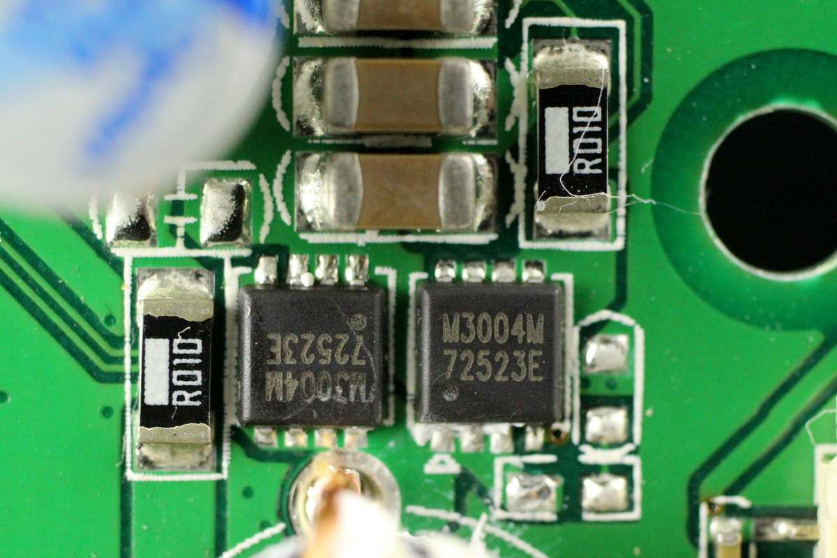 电池保护管特写,采用QM3052M6,两颗并联对向串联。