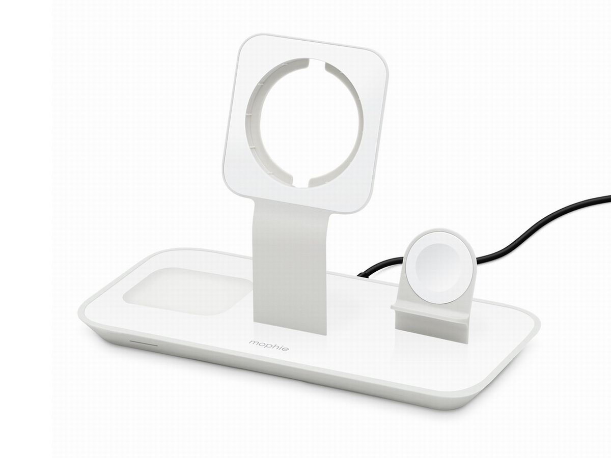 mophie 三合一无线充电底座为用户提供一站式无线充电服务,拥有三个独立的无线充电区域,可以轻松地为各款设备充电,底部三个独立的白色指示灯方便用户查看设备的充电状态。立式无线充电支架倾斜设置,内置7.5W无线发射模块,方便iPhone充电时操作界面。两侧分别是AirPods无线充电区域、Apple Watch磁吸无线充电区域,用于外设配件进行无线充。售价为1098元人民币。